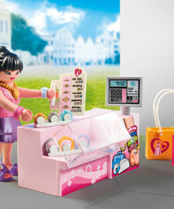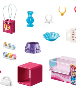 Para un outfit perfecto, los accesorios no pueden faltar. Los relojes y la joyería fina están disponibles en el stand de accesorios de moda. Acaban de llegar los últimos modelos de relojes que los fans de la moda no pueden perderse. El conjunto incluye una figura de PLAYMOBIL, un puesto de venta de accesorios con relojes, joyas, tabla de precios y otros grandes extras.