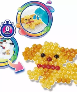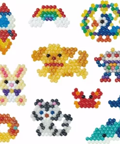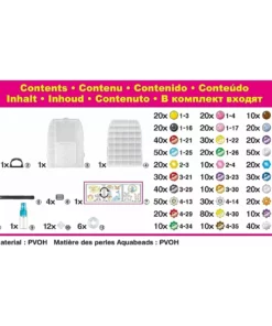 Incluye: una mochila azul turquesa con asa y cierre hermético que incluye más de mil abalorios Aquabeds en colores: amarillo, rojo, negro, verde ,azul, un bolígrafo creador de doble punta, un pulverizador, una hoja con plantillas para diseñar, clavijas de diseño, una guía de instrucción.