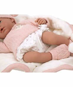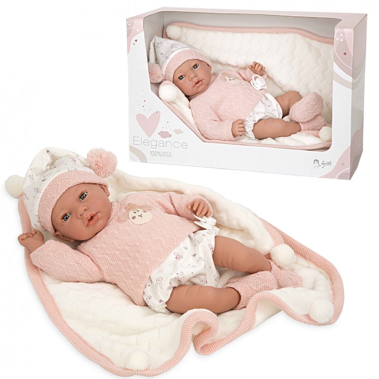 Muñeca Elegance 40 cm Andie con ojo durmiente y 14 sonidos.Si le aprietas la barriguita, hace 10 sonidos diferentes. Si le pones y le quitas el chupete, hace 4 soniditos.