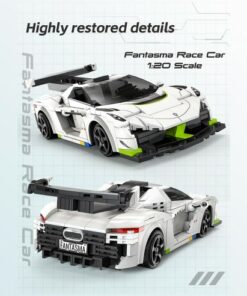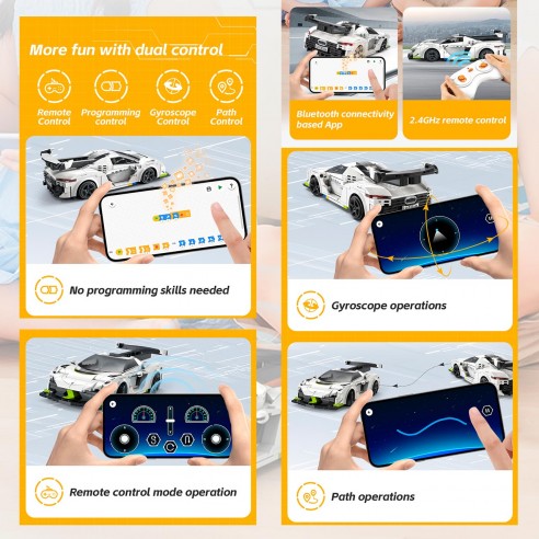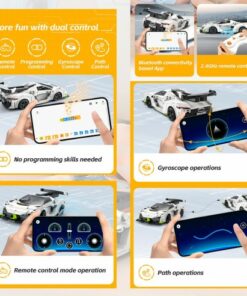 Coche deportivo blanco con detalles verdes aerodinámicos. El vehículo puede ser controlado por el control remoto de 2.4GHZ y la aplicación Bluetooth, disponible en versiones Android e IOS. Disfruta de tus turnos con los 4 modos de conducción que te ofrece la App de CADA (giroscopio, scratch de programación, control desde tu móvil o editar tu propia ruta).