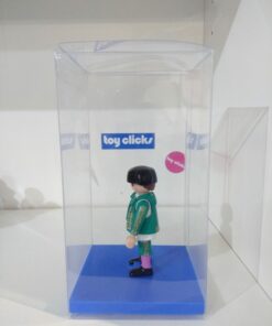 Caja de acetato transparente con una base fabricada en 3D para que la figura o clicks quede de pie en el interior de la caja. La caja se envía plegada junto a la base 3D, los colores de la base en caso de querer alguno en especial ponerse en contacto con nosotros. medias de la caja 8x8x15cm.