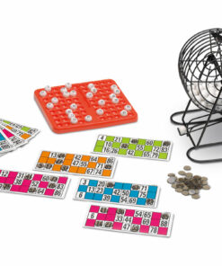 Con bombo de metal y bolas, base y fichas de marcar de plástico. Incluye 48 cartones.