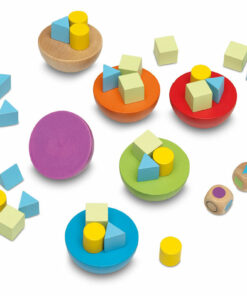 ¡Prepárate!, ¡calma tus nervios!, deberás poner las piezas con distintas formas sobre las bases de colores según indique los dados, pero ¡Ojo! A ver como las pones para que la base no se balancee y tire todas las piezas.