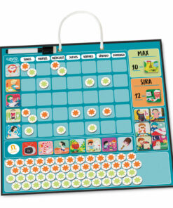 Si necesitas una herramienta para que los pequeños aprendan y se acostumbren a hacer sus tareas, ésta es la perfecta. Sirve para dos niños y cada uno tendrá su puntuación. La tabla tiene 11 tareas y 9 recompensas. 70 estrellas para marcar los logros y un rotulador con borrador para que escribáis los días de la semana, el nombre de los niños y las estrellas que deben conseguir para obtener la recompensa. Y finalmente que tus hijos escojan contigo el premio que quieren ganar. Durante toda la semana deberás invitarlos a que coloquen sus estrellas a medida que vayan cumpliendo las tareas asignadas. También recomendamos que al principio marquemos objetivos más fáciles y con el paso del tiempo vayamos aumentando su dificultad, para aumentar el autoestima de los niños.