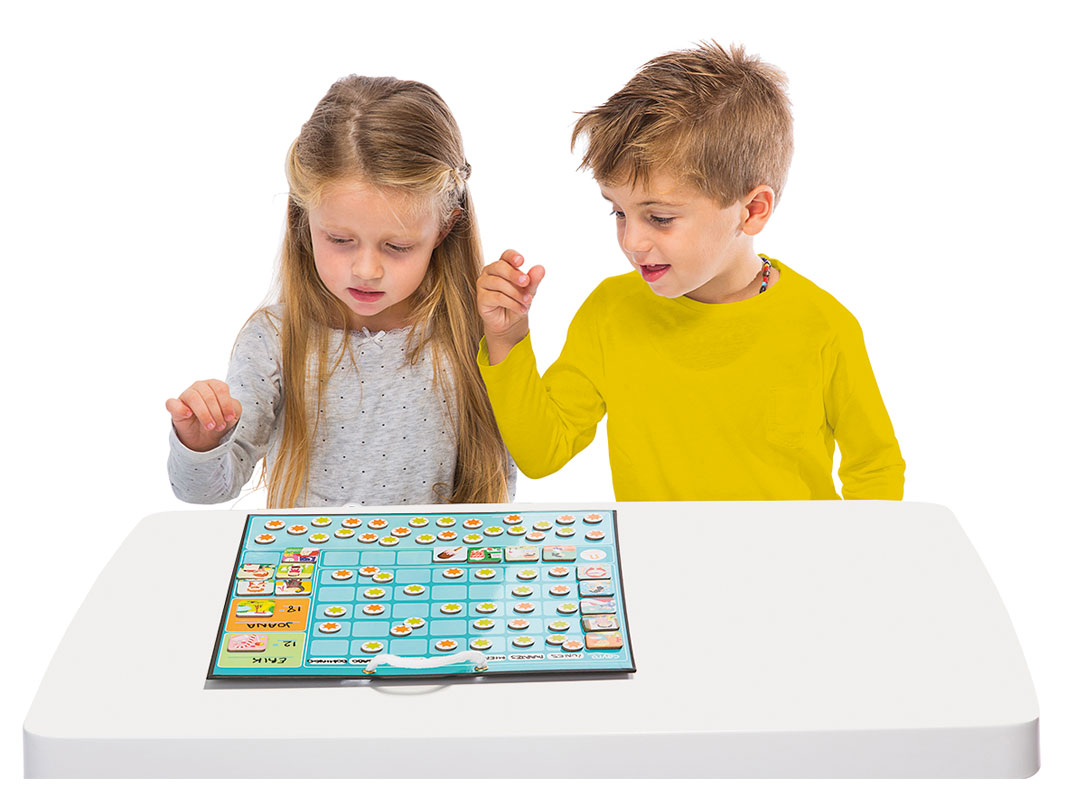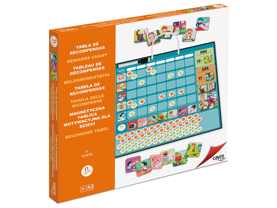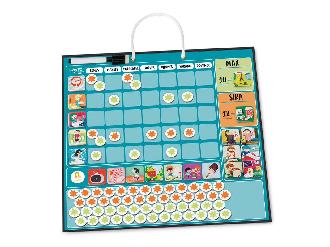 Si necesitas una herramienta para que los pequeños aprendan y se acostumbren a hacer sus tareas, ésta es la perfecta. Sirve para dos niños y cada uno tendrá su puntuación. La tabla tiene 11 tareas y 9 recompensas. 70 estrellas para marcar los logros y un rotulador con borrador para que escribáis los días de la semana, el nombre de los niños y las estrellas que deben conseguir para obtener la recompensa. Y finalmente que tus hijos escojan contigo el premio que quieren ganar. Durante toda la semana deberás invitarlos a que coloquen sus estrellas a medida que vayan cumpliendo las tareas asignadas. También recomendamos que al principio marquemos objetivos más fáciles y con el paso del tiempo vayamos aumentando su dificultad, para aumentar el autoestima de los niños.