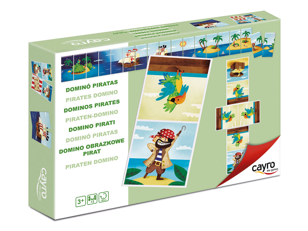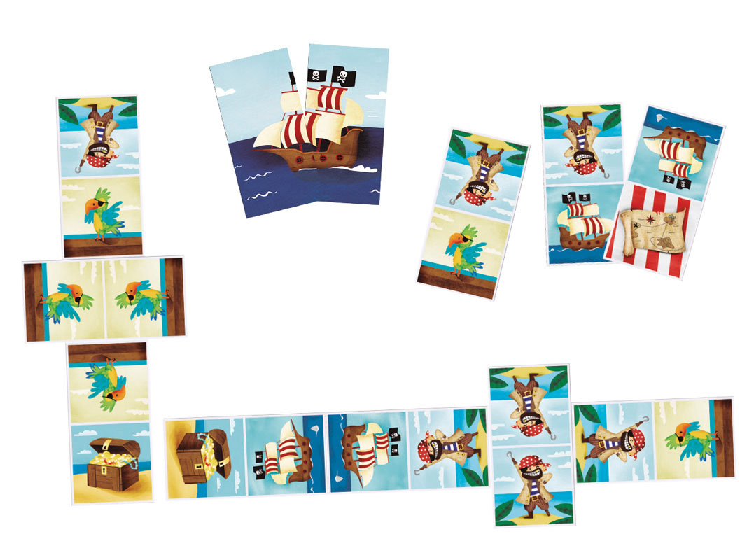 Con este juego los niños y niñas que no sepan los números, podrán jugar sin problemas al dominó, pues solo deben hacer coincidir los dibujos. Además, por el reverso de las fichas, se puede formar un paisaje con personajes e inventarse una historia sobre los más “terribles” piratas y sus hazañas