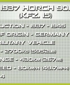 Utilizando un conjunto de 178 bloques de construcción COBI, construirás un automóvil de pasajeros militar Horch 901 (Kfz.15) con pintura del Afrika Korps. El coche se lanzó a escala de modelismo 1:35. Todos los detalles gráficos son impresiones de alta calidad que no desaparecen ni siquiera con un uso intensivo. La ventaja es la estructura, que refleja de forma única las formas originales de su prototipo histórico. El modelo continúa una serie de coches históricos que fueron creados utilizando elementos especialmente diseñados para este fin. El conjunto incluye fantásticos guardabarros de varias piezas, un bloque que imita un radiador, un cristal de arena y muchos otros elementos útiles. El coche es de construcción sencilla y susceptible de modificaciones. ¡Los constructores más experimentados pueden utilizar fácilmente los elementos disponibles para crear otras versiones de automóviles o camiones! El set incluye una figura de un soldado del Afrika Korps equipado con una gorra con estampado y una metralleta MP 40. La