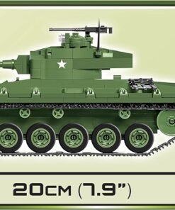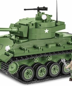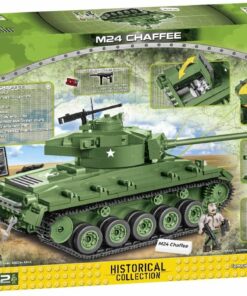 El M24 Chaffee fue un tanque ligero estadounidense de la Segunda Guerra Mundial. Entre 1944 y 1945 se fabricaron 4.731 unidades. Sustituyó con éxito al tanque ligero M3/M5 Stuart. El Chaffee estaba equipado con blindaje soldado, dos motores y un cañón de 75 mm, que anteriormente había sido diseñado para el bombardero B-25 Mitchell. Fue el primer tanque aliado occidental en utilizar barras de torsión como suspensiones. En ocasiones, los soldados aliados abrieron fuego contra sus propios tanques porque el chasis del Chaffee se parecía a un Panzer II alemán y a un Panther. El tanque se utilizó en batallas en Francia, Italia y el Tercer Reich. Después de la guerra, el M24 permaneció en servicio en las tropas estadounidenses. Gozó de gran popularidad y encontró muchos compradores en todo el mundo. El M24 también se utilizó en la Guerra de Corea. Unidades pertenecientes a Francia lucharon en Indochina y Argelia. En la Guerra de Vietnam fueron utilizados por el ejército de Vietnam del Sur. Hasta el día de hoy están activos en el ejército uruguayo. A partir de 588 bloques de construcción COBI, construirás un modelo perfectamente diseñado del tanque ligero M24 Chaffee. El modelo tiene tracción sobre orugas, una torreta giratoria y un cañón móvil. Bajo la trampilla de servicio que se abre, encontrarás dos motores para construir con ladrillos. En la torreta hay una escotilla que se abre y una ametralladora. En el modelo hay impresiones extremadamente duraderas que no se rayan ni manchan, incluso durante el juego intenso. Se incluyen dos figuras de tropas estadounidenses. La primera figura es un comandante de tanque equipado con una metralleta M3 (lubricador) y binoculares. Está acompañado por un mecánico de tanques equipado con una llave inglesa. Ambos soldados tienen un nuevo tipo de casco de tanque. El set seguramente complacerá tanto a los fanáticos de los ladrillos más jóvenes como a los coleccionistas adultos. Los constructores de dioramas seguramente lo usarán para recrear el final de la Segunda Guerra Mundial. Después de pequeñas modificaciones, el set también funcionará en el teatro de hostilidades en Corea y Vietnam.