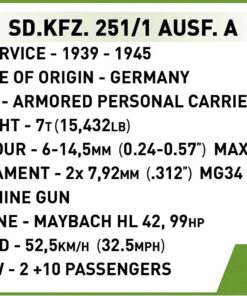 El Sd.Kfz.251 fue el vehículo blindado de transporte de personal semioruga básico del ejército alemán durante la Segunda Guerra Mundial. Su producción duró de 1939 a 1945. Sobre esta base también se construyeron otros vehículos de combate. Se produjo en cuatro modelos de producción, del A al D, y 23 versiones básicas y muchas de campo, de las cuales el estándar y más numeroso era el vehículo blindado de transporte de tropas Sd.Kfz.251/1. El diseño del transportador Sd.Kfz.251 se basó en un chasis Sd.Kfz.11 modificado. El casco blindado estaba hecho de placas de blindaje soldadas y constaba de dos grandes partes unidas por pernos. La parte delantera terminaba detrás del puesto del conductor. Protegía al conductor, al comandante y al motor. Se suponía que el compartimiento de combate, abierto desde arriba, tenía capacidad para 10 soldados. La puerta trasera, grande y que se abría hacia afuera, daba acceso al interior.