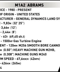 Utilizando un conjunto de bloques de construcción COBI, construirás un tanque Abrams en la versión M1A2, desarrollado bajo licencia de General Dynamics Land Systems. El modelo fue reproducido en una fantástica escala de 1:35. La última versión de este tanque superior tiene detalles aún más detallados. Esto fue posible gracias al uso de nuevos bloques del catálogo cada vez mayor de elementos creado por COBI. El modelo contiene únicamente impresiones de alta calidad que no desaparecen durante el uso. El vehículo tiene un sistema de orugas que funciona y escotillas que se abren en las que se puede colocar a la tripulación. La torreta y el cañón del vehículo son móviles. Debajo de la trampilla de servicio extraíble se encuentra un motor reproducido a partir de bloques. El tanque Abrams ha sido enriquecido con accesorios como: una bolsa para bloques, orugas de repuesto, municiones y dos ametralladoras. La trampilla que se abre permite acceder al motor recreado a partir de bloques. El set incluye una figura muy interesante de un conductor de tanque estadounidense equipado con una pistola personal.