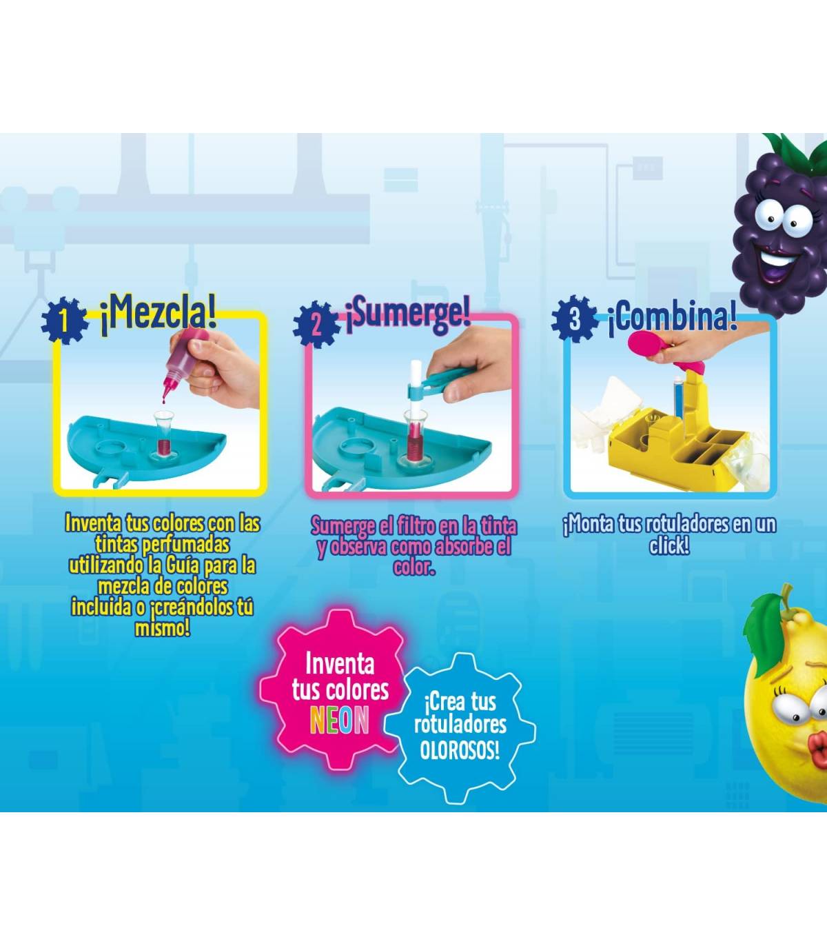 - INFORMACIÓN ÚTIL: Unidad de laboratorio de rotuladores, 3 frascos de tinta perfumada, 14 juegos para crear rotuladores, 2 tubos para medir la tinta, 2 hojas de etiquetas, 1 pinza, 1 guía