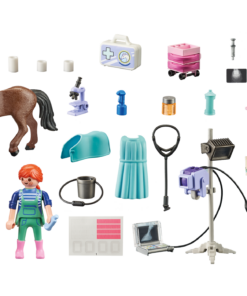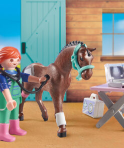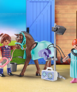 ¿Te gustan los animales? Ayuda al Veterinario de Caballos con la máquina de rayos X móvil. El veterinario toma imágenes de la pezuña del caballo lesionado. A continuación, observa las imágenes con detenimiento en el ordenador portátil. El set incluye etiquetas para vendar al animal y otros utensilios que se guardan en el práctico armario lateral con ruedas. Un set de juego ideal para las niñas y los niños a los que les gustaría ser veterinarios algún día.