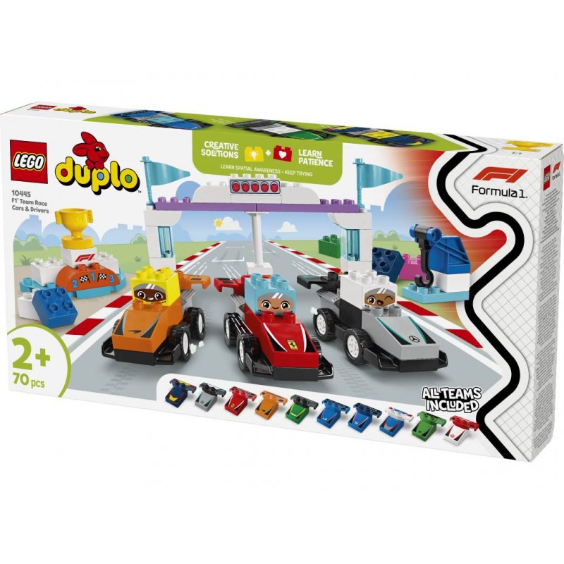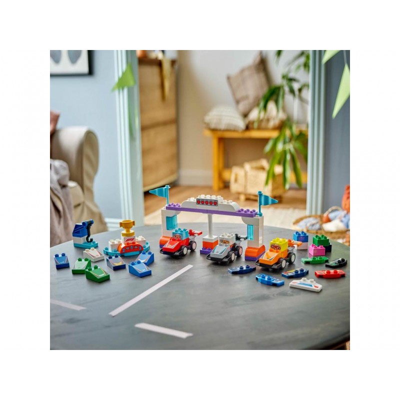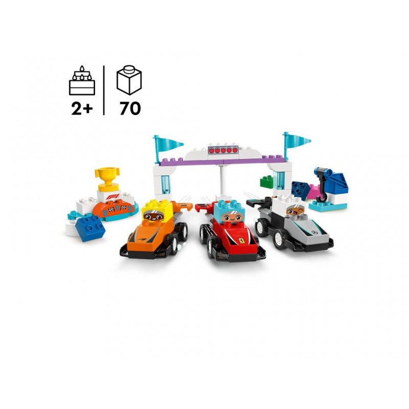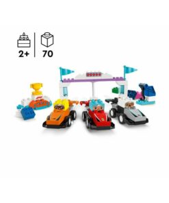 Este set LEGO regalo idóneo para niños y niñas a partir de 2 años amantes de los coches de juguete y de la fórmula 1. Este juguete educativo ayuda a los bebés a desarrollar su percepción del espacio y a practicar sus habilidades de motricidad fina usando la función de elevación de la grúa de juguete para una rápida parada en boxes. Aprenderán a clasificar emparejando a los equipos con sus colores, ¡y a perseverar compitiendo contra sus familiares hasta cruzar la meta los primeros!
