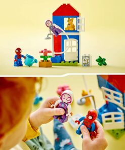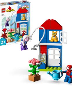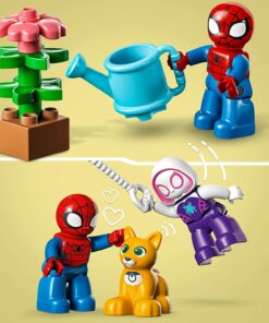Elementos orientados al juego imaginativo: Incluye una figura de Spidey, a Spider Fantasma y al gato Bootsie, una planta que crece, una regadera, un elemento que representa una telaraña y un edificio con una puerta y una ventana que se abren
