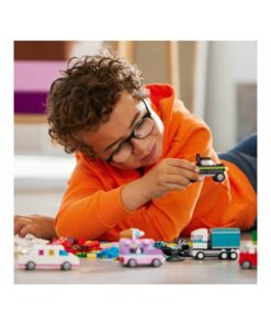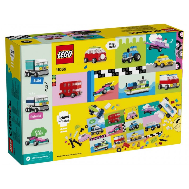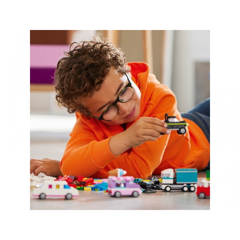 Con 900 ladrillos de construcción, elementos especiales y 52 ruedas, además de instrucciones fáciles de seguir, los peques pueden construir un coche de policía, un camión de los helados, un quad, un cargador frontal, un camión, un coche familiar, un todoterreno y una limusina de juguete. Después, basándose en las ideas sobre diseños, detalles y decoraciones, podrán reconstruir los vehículos de muchas otras formas. Y, a medida que desarrollen sus habilidades de construcción creativa, se atreverán con sus propios diseños inspirándose en las 10 imaginativas ideas incluidas. Las instrucciones también están disponibles en la app LEGO Builder: su intuitiva guía de construcción.