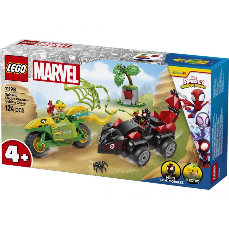 El juguete de Spider-Man recrea la acción de la temporada “Dinotelarañas” de la serie para televisión Spidey y su superequipo. Viene con 2 minifiguras LEGO y 2 dinovehículos: Miles “Spin” Morales en el Coche Estegosaurio y Electro en la Moto Dilofosaurio de juguete. Una gran telaraña, un cristal oculto en una roca y accesorios que representan el paisaje pondrán en marcha el juego de interpretación creativo. Cada bolsa de la caja contiene ladrillos y un gran ladrillo para principiantes que permiten construir rápidamente el modelo y al personaje. Incluye instrucciones en forma de colorida historia visual.