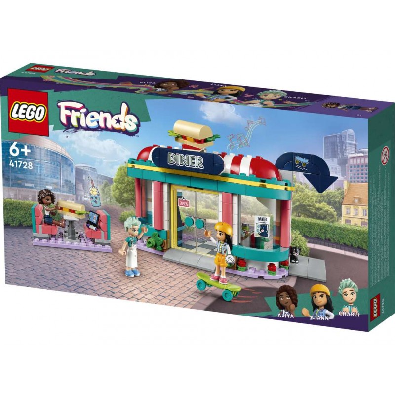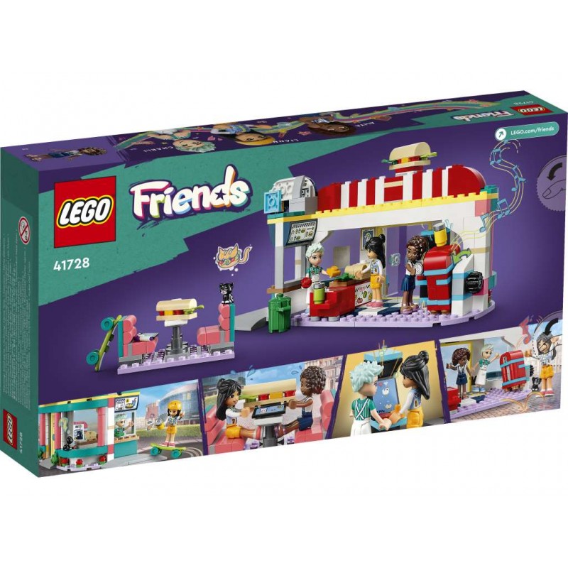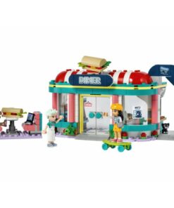 Con los montones de accesorios para estimular el juego creativo que incluye este set de juguetes de construcción, imaginarán que preparan bocadillos o que se sientan a comer en el restaurante. Cuenta con terraza exterior, una ventana para servir a los clientes directamente en su vehículo y, además, con una máquina recreativa y una gramola móvil. Las niñas pueden usar los ingredientes de ensalada que se conservan en el frigorífico para hacerse bocadillos especiales. Contiene 2 bebidas, dinero, 3 rebanadas de pan, un servilletero, un cubo de basura y un monopatín. ¡Y hasta hay un travieso gato que se pasea por el local!