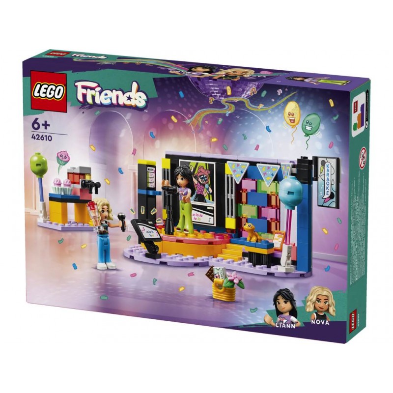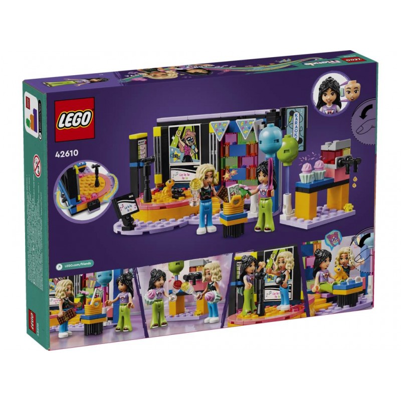 El set LEGO Friends Fiesta Musical de Karaoke (42610) cuenta con escenario de juguete, micrófonos, zona de relax y máquina de granizadas para celebrar una fiesta de cumpleaños de karaoke. Incluye 2 personajes de LEGO Friends (traen caras adicionales con gesto de cantar), una figura de un geco hembra y numerosos accesorios.