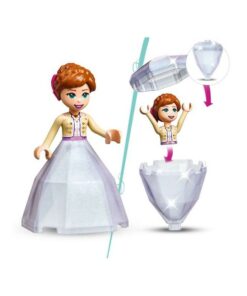 ¿Qué contiene el set? Este set de 74 piezas incluye un patio con una fuente construible y un vestido “diamante” transformable, diseñado para guardar un minipersonaje en el interior