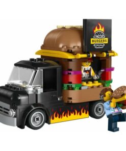 El puesto de comida rápida móvil, que tiene la forma de una hamburguesa gigante, puede desengancharse del camión de juguete y cuenta con una detallada zona de cocina, con condimentos y con una ventana de atención al cliente que se abre, decorada con el logo del negocio: una hamburguesa a la parrilla. El food truck de juguete incluye también minifiguras de una vendedora y un cliente con un audífono.
