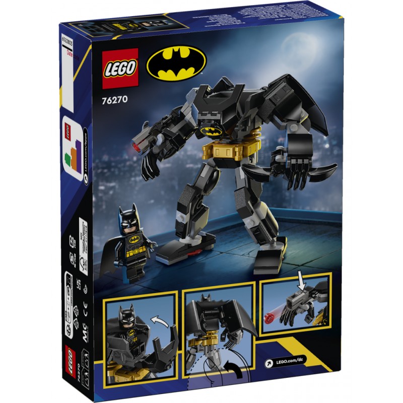 Los peques insertan la minifigura LEGO de Batman en la cabina abatible de la armadura de juguete. La figura articualda del meca sostiene un Batarang construible y tiene un lanzador en el brazo. Lleva una mochila propulsora cubierta por una capa de 2 partes, colocable en varias posiciones. La minifigura LEGO de Batman viste una capa de tela y sostiene otro Batarang, que se guarda en el brazo derecho de la armadura robótica. Los brazos, piernas y manos articulados del meca permiten librar emocionantes combates a los fans de Batman y las figuras de superhéroes. Los niños pueden combinar este juguete de Batman con otros mecas LEGO de la gama (a la venta por separado). Para disfrutar de diversión digital, los constructores cuentan con la app LEGO Builder.