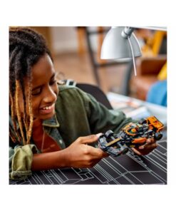 la maqueta del coche McLaren incluye numerosas características de gran realismo: los colores distintivos negro y papaya, los logotipos de los patrocinadores del equipo, las ruedas con el nombre de Pirelli y el halo de seguridad papaya. El coche de este kit construible viene con una minifigura LEGO de un piloto.