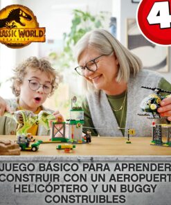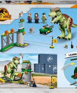 Contiene un aeropuerto con helisuperficie, un garaje, un helicóptero, un buggy y una alambrada derribable, además de una figura articulada de un T. rex. Incluye también 3 minifiguras (Owen Grady, Zia Rodríguez y un protector de la fauna) con accesorios, como un huevo de dinosaurio y un walkie-talkie que estimularán el juego creativo.
