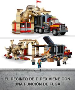 Set con un T. rex de juguete: Los fans de la película Jurassic World Dominion podrán interpretar la Fuga de los Dinosaurios T. rex y Atrocirraptor (76948) con 2 figuras articuladas de dinosaurios, un camión construible y un mercado
