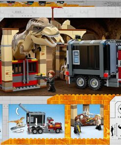 4 minifiguras y 2 dinosaurios: Owen Grady, Rainn Delacourt, Soyona Santos (cada uno con elementos que representan armas de dardos tranquilizantes) y Claire Dearing; además, un T. rex que mide aproximadamente 11 cm de altura y un Atrocirraptor