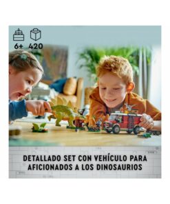 El vehículo cuenta con asientos para 2 minifiguras, un rastreador de dinosaurios extraíble y un remolque desmontable con jaula que se abre para la figura de un dinosaurio. Además, el set incluye 3 minifiguras LEGO® (Ian Malcolm, la Dra. Ellie Sattler y un guardia con un elemento que representa un arma de dardos tranquilizantes), así como figuras de juguete de un Pyrorraptor y un Dilofosaurio para estimular la narración creativa.