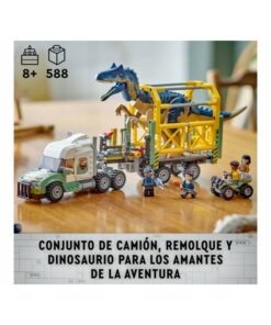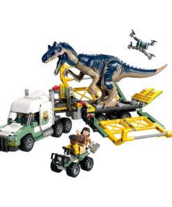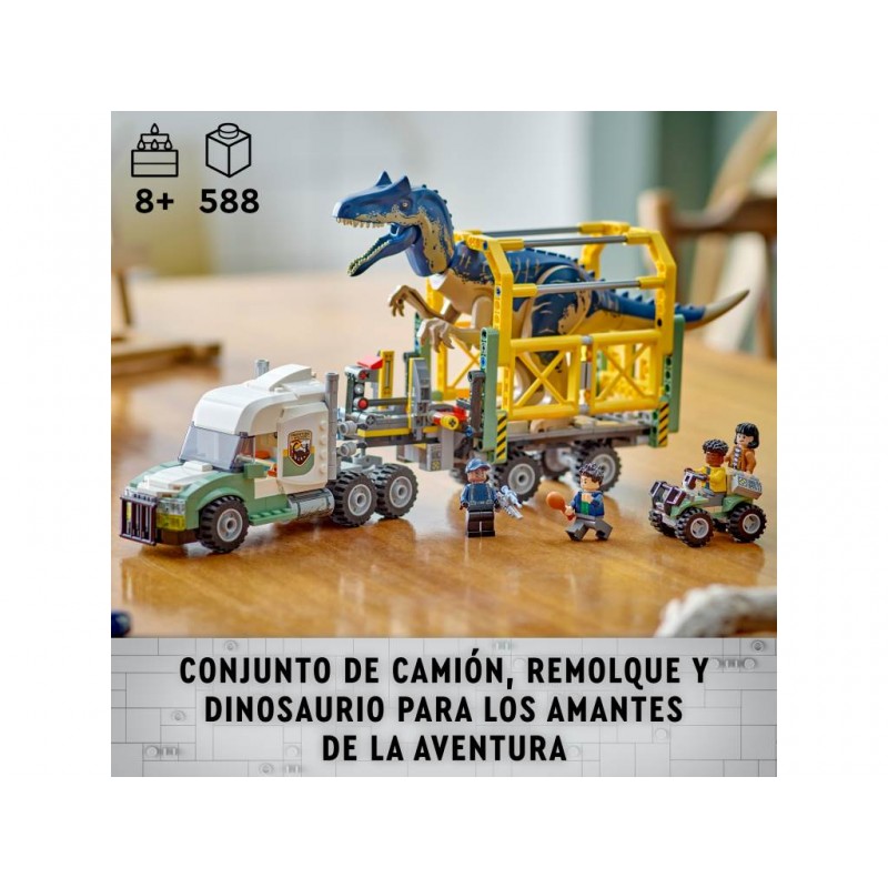 Este juguete LEGO Jurassic World es un regalo óptimo para niños y niñas de 8 años o más. Permite a los niños contar un sinfín de trepidantes historias protagonizadas por la figura moldeada de un dinosaurio Allosaurus con patas, cabeza y boca móviles, y por las minifiguras LEGO de Darius, Kenji, Yaz y un guarda. Hay un camión de juguete articulado con techo y capó que se abren, una cabina para 3 minifiguras LEGO con cama, un tráiler con soportes frontales, rampa trasera y jaula que se abre presionando una palanca, un quad y un dron, además de montones de elementos para inventar historias.