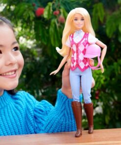 Inspirada en la serie de Netflix Barbie Mysteries: The Great Horse Chase, la muñeca Barbie Malibu está lista para montar fuera de la pantalla y divertirse galopando. Con su chaleco rosa a rombos, sus pantalones, sus botas y su casco extraíbles, está preparada para vivir aventuras a caballo. La muñeca de moda se dobla por los codos, las muñecas y las rodillas para montar de forma realista y divertirse imitando.