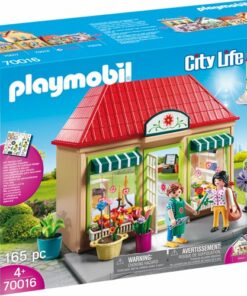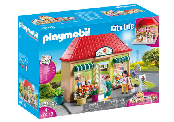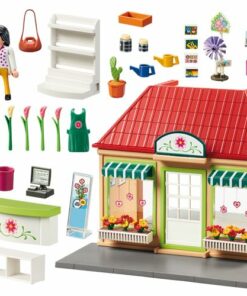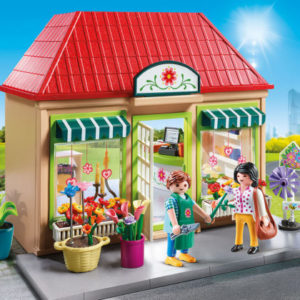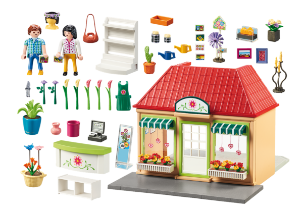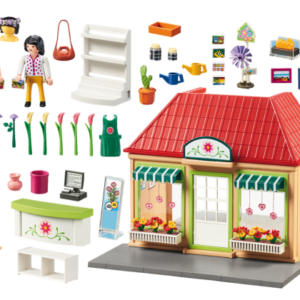 Hay hermosas flores y decoraciones para tu pequeña ciudad en tu tienda de flores. Incluye pegatinas para decorar.