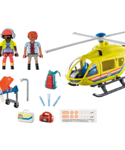 Despega el moderno helicóptero de rescate de PLAYMOBIL. El helicóptero tiene palas de rotor móviles, así como puertas laterales, portón trasero y ventana de la cabina para abrir. Hay espacio para dos pilotos en la cabina. Los pacientes heridos pueden ser introducidos en el helicóptero en la camilla de rescate y llevados al hospital. Se realizan los primeros auxilios en el lugar del accidente, a bordo del helicóptero hay un botiquín médico y un equipo de primeros auxilios. Un detallado juego de juguetes mentes con inquietudes médicas. Set de juego PLAYMOBIL A partir de 4 años, incluye tres figuras PLAYMOBIL, un helicóptero de rescate, una camilla de ambulancia, un botiquín de primeros auxilios y muchos otros extras. Con el vendaje, los heridos son tratados individualmente. Las patas rodantes de la camilla se pueden plegar y la camilla puede ser transportada por dos personas con asas. La serie PLAYMOBIL City Life incluye modernos vehículos y modelos realistas para desarrollar importantes habilidades y confianza en sí mismos.