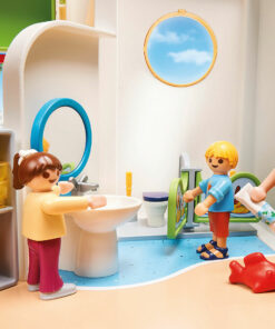 Equipado con mesas para los niños, sillas, rincón de juegos y cocina. Incluye timbre que funciona y luz exterior. Se puede combinar con la Habitación de Bebés (70282 – se vende por separado).