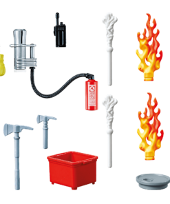 El bombero apaga el fuego con su pistola de espuma. Un set en una atractiva caja para escribir tu nombre.