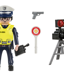 Figuras: 1 policía Accesorios: 1 llana policial, 1 trampa de radar, 1 llana de policía, 1 radio, 1 gorra de policía, 1 chaleco de policía, 1 pistola, 1 cinturón de pistola