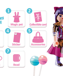 ¡Bienvenido al mundo de los sueños, Bienvenido al reino de EverDreamerz! Rosalee, Viona, Edwina, Clare y Starleen son cinco amigas con grandes sueños, cuando encuentran un amuleto mágico, se abre un portal a otro universo, la tierra de sus sueños. Primero, las cinco amigas viajan al mundo de los sueños de Rosalee, donde todo gira en torno a los dulces. A Viona, la soñadora, le encanta comer chocolate, al igual que su pequeña compañera fiel, un lindo osito panda. Tarta de chocolate, magdalenas, helado, pan de jengibre, por suerte hay muchas golosinas de chocolate en el Reino de los Dulces Sueños. Para el hambre, Viona simplemente muerde una barra de chocolate, que siempre lleva en su bolsillo. Además de su pasión por el chocolate, a la creativa Viona le encanta escribir poemas y pintar maravillosos cuadros. La creatividad de Viona a menudo ayuda a las chicas en situaciones difíciles a encontrar una solución original. El set de juego contiene el personaje de EverDreamerz Viona con su panda bebé morado y hoja de bambú, pastel de chocolate, corazón de pan de jengibre, magdalenas, helado de chocolate, leche, así como bolso, taza y una pulsera con perlas y un colgante encantador. Para coleccionar: Cada figura de Everdreamerz tiene su propia pulsera de silicona con un colgante, para coleccionar e intercambiar. La figura y sus accesorios se pueden guardar y llevar en la colorida caja.