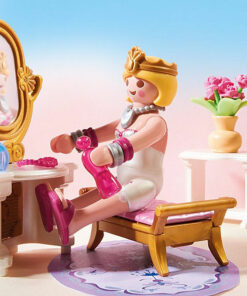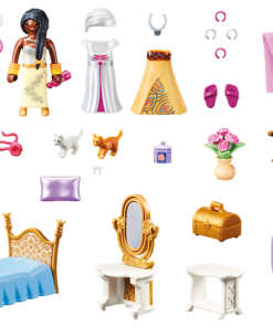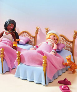 ¡Es hora de dormir! Las princesas se relajan en las cómodas camas. Con tocador, camisón, joyas y gatitos.