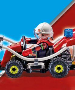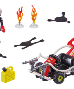 Las llamas a menudo se reavivan durante un stunt show. Sin embargo, si se vuelve muy peligroso, el Stuntshow Kart Bombero está preparado para actuar. El kart está equipado con dos lanzas de fuego. Con este quad incluso los incendios pueden ser controlados en poco tiempo. El set incluye un bombero PLAYMOBIL con casco y guantes, mangueras, botes y otros extras.