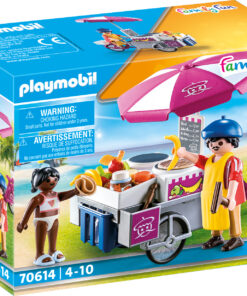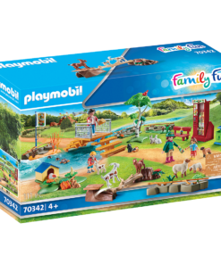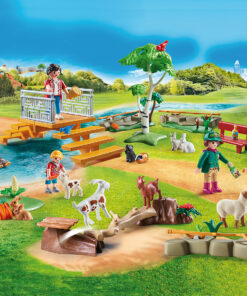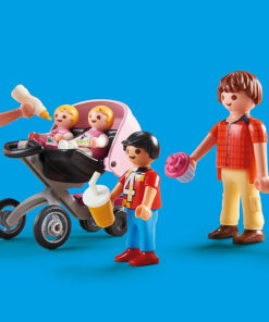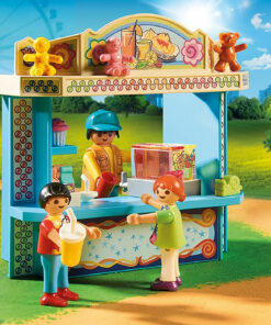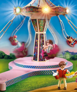 ¡Hurra! ¡Hoy vamos a la Feria! Los niños están ansiosos por probar el carrusel. Ronda tras ronda vuelan por el aire. Mamá prefiere esperar abajo con los gemelos y papá ha comprado un delicioso caramelo en el puesto de refrescos. Después van a los columpios. ¡Qué divertido! El set contiene seis figuras de PLAYMOBIL, cinco figuras infantiles, un carrusel con iluminación, columpios y un puesto de refrescos con máquina de hielo, bebidas y juguetes. Las seis góndolas del carrusel se ponen en marcha mecánicamente girando la manivela. Las pilas no están incluidas en el juego.
