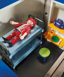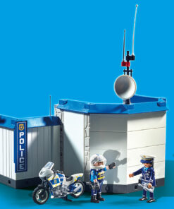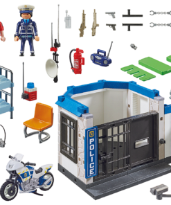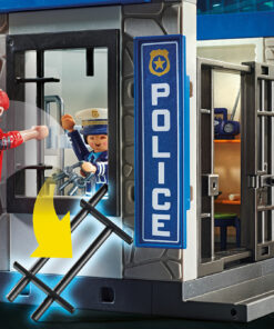 Hoy parece un día tranquilo en la comisaría de policía. Pero las apariencias engañan. De repente, se escuchan ruidos extraños procedentes de la celda. El prisionero ha escapado por la ventana. Rápidamente, la mujer policía busca la radio e informa a su compañero. El policía inmediatamente emprende la persecución en la moto. El ladrón es arrestado y llevado a su celda esposado. El set contiene tres figuras de PLAYMOBIL, una comisaría con una celda, estanterías y una máquina de café, una moto de policía y muchos otros extras para emocionantes aventuras policiales.