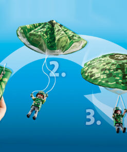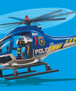 Operación policial de gran envergadura. El ladrón quiere escapar con paracaídas. Mientras el ladrón se desliza lentamente hacia el suelo, el policía, desde la cabina del helicóptero, lo vigila. Cuando aterriza, ya lo está esperando. El siguiente viaje será la cárcel. El set contiene dos figuras de PLAYMOBIL policía y ladrón, un helicóptero policial, un paracaídas y muchos otros extras para emocionantes persecuciones aéreas. Lanza el paracaídas y la figura al aire y mira cómo flota en el suelo.