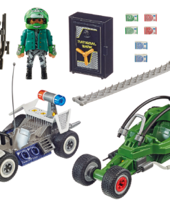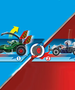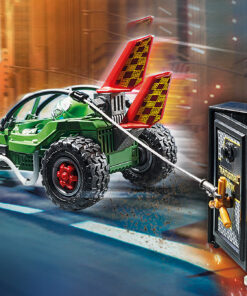 Este ladrón no se detiene ante nada. Para robar la caja fuerte, la ató a su kart con una cuerda y simplemente la arrancó de la pared. Ahora se va por las calles con la caja fuerte a cuestas. Pero el astuto criminal ha hecho sus cálculos sin la valiente policía de PLAYMOBIL. Con su ágil kart de policía, el oficial lo corta y desenrolla una cinta de clavos en un instante, lo que pone fin a la campaña de robo en un abrir y cerrar de ojos. El juego contiene dos figuras de PLAYMOBIL, dos karts con motor de retroceso, una caja fuerte, una cinta de clavos, billetes y muchos otros extras.