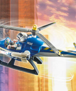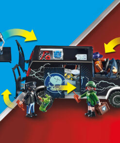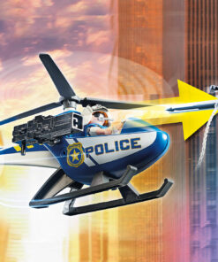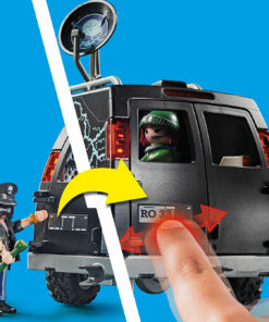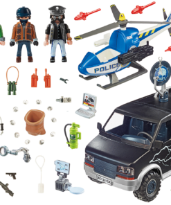 El trío de gánsters ha estado planeando el robo de joyas meticulosamente durante semanas. Su furgoneta negra es un centro de robo móvil con ordenador y laboratorio. En la pared de la estantería hay espacio para palancas y cortadores de vidrio. El jefe de los gánsters ha estudiado los planos del museo en detalle para que el robo se ejecute con éxito. Ahora comprueban la pureza de los diamantes con una lupa. Son piedras de la mejor calidad. Justo cuando los ladrones están brindando por su exitoso golpe con champán, se puede escuchar el sonido de un helicóptero. Los ladrones se ponen en marcha rápidamente, pero el piloto les pisa los talones. Con un fuerte golpe el gancho de agarre golpea la parte trasera de la furgoneta y detiene el vehículo. Los ladrones no han podido disfrutar de sus diamantes durante mucho tiempo. El set contiene cuatro figuras de PLAYMOBIL, un helicóptero con un gancho, una camioneta con antena satélite, una estación de trabajo con ordenador y un estante para herramientas de robo. Las puertas traseras de la furgoneta se pueden abrir, el techo es desmontable y las placas de matrícula cambian por fricción.