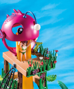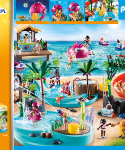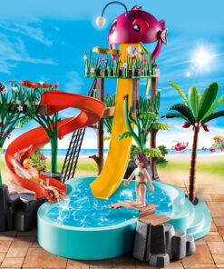 Chapotea durante todo el día en el Parque Acuático con tobogán de PLAYMOBIL. Los diferentes toboganes y el trampolín garantizan una maravillosa diversión acuática. Empieza subiendo por la escalera de cuerda hasta la torre de vigilancia antes de bajar por el tobogán hasta el agua. ¿Quién se atreve a lanzarse por el tobogán extremadamente empinado a través de la trampilla de la gran cabeza de pez? Mientras el pequeño pone a prueba los toboganes, mamá demuestra su habilidad en el trampolín. ¡Aquí los amantes del agua están en su salsa! El set de juego incluye dos figuras PLAYMOBIL, madre e hijo en traje de baño, una piscina con dos toboganes y trampolín, dos morenas y muchos otros extras. La piscina se puede llenar de agua. Para saltar al agua, basta con fijar una figura en el extremo del trampolín con sus pies, empujar hacia abajo el trampolín y soltarlo.