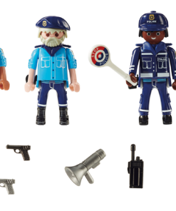 Consigue refuerzos para el equipo de policía de PLAYMOBIL con el set de figuras policía. Tres figuras adicionales equipadas con megáfono, paleta, radio y otros extras te están esperando.