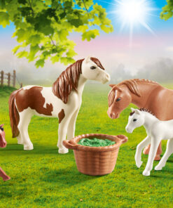 ¿Todavía hay espacio en la granja de ponis? Entonces esta feliz familia de caballos puede mudarse de inmediato. Dos ponis y dos potros esperan ser atendidos con cariño. El set de juego contiene dos ponis, dos potros y una cesta de comida y es ideal como complemento para la granja de ponys (6927) o el carro nocturno del campamento de ponis (70510).