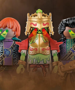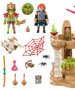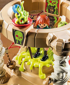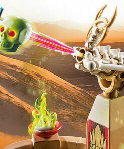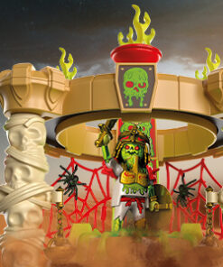 El reluciente templo de Sal’ahari Sands es lo que los espeluznantes guerreros esqueléticos llaman hogar. Es aquí donde el ejército de no muertos, liderado por el temible Skeleton King Sul’thanath, planea su próximo movimiento contra Novelmore. Como no muertos, no temen a nada ni a nadie. Si alguien se atreve a acercarse al templo, es recibido con balas de calavera del cañón de los esqueletos. Antes de cada batalla, los no muertos reponen su energía. Para ello, se colocan en el manantial mágico que hay en el centro del templo y esperan a que les cargue por completo y sus ojos empiecen a brillar. No se debe jugar con estos siniestros guerreros del desierto. El set de juego contiene el Skeleton King Sul’thanath, así como los dos aprendices de brujo Omagus y Andowan, un templo con módulo de luz, cañón esquelético, telas de araña, antorchas y muchos otros extras. La cabeza de las figuras está equipada con un dispositivo de almacenamiento de energía que puede cargarse mediante la bobina de inducción del templo, lo que hace que los ojos de las figuras brillen.