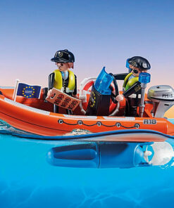 El puerto, puerta del mundo. Aquí llegan todos los días mercancías de muchos países diferentes. Otro gran buque de carga acaba de entrar en la dársena del puerto y la capitana está haciendo maniobras hasta la terminal con una precisión perfecta. A bordo hay varios contenedores de gran tamaño, que ahora se descargan sin esfuerzo con la ayuda de la grúa de carga móvil. Para cumplir el apretado calendario, cada detalle tiene que encajar, pero la capitana y su tripulación son verdaderos profesionales. Por supuesto, toda la mercancía está debidamente declarada en la aduana. Los funcionarios ya están preparados en su barco de aduanas. Una gran diversión de juego para los amantes de la logística. El set de juego incluye cuatro figuras PLAYMOBIL, un barco de carga con grúa giratoria, un barco de aduanas, un contenedor, prismáticos, megáfono y muchos otros extras geniales. El barco de carga flota y es compatible con el motor submarino. Playmobil® 5159 Motor Submarino